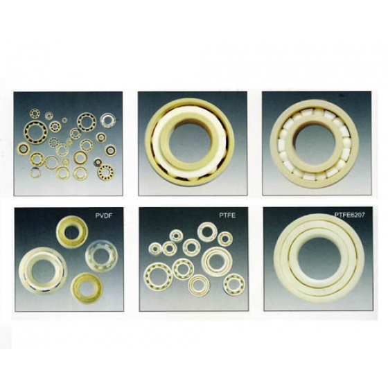 PEEK/PI塑膠軸承(耐高溫塑膠軸承): PEEK、PI 作為新興的工程塑膠材料,被證明是所有已知工程塑膠中 機械強度尺寸穩定性及耐高溫性能最好的,其中PEEK長期使用溫度 達260度C,PI長期使用溫度更是高達300度C,且其具有優良的耐腐 蝕性能,在中等強度的酸鹼腐蝕環境仍然可以運轉自如,故一般用 於製作需要在比較嚴酷環境中精密運轉的軸承,其缺點是因材料本 身比較昂貴,故使用成本較高,一般內外圈材料選用PEEK或PI,保 持架材料為PTFE、PEEK或PI,滾珠一般為ZrO2或Si3N4陶瓷球。 PVDF/PTEE塑膠軸承(耐腐蝕塑膠軸承): 作為氟塑料中最典型的品種,PTEE和PVDF是具有最優良的耐腐蝕性 能,其中PTEE更是所有已知工程塑膠中耐腐蝕性最好的,可用於所 有的強酸及強鹼場合,包括HF及發煙硫酸硝酸(98%以上)等,且具 有良好的高溫表現,PTEE證明可用於180度C的高溫,PVDF也能用到 150度C,但PTEE材料強度極低,且尺寸穩定性較差,溫度變化大, 相比較而言PVDF具有更佳的綜合性能,一般內外圈材料選用PTEE或 PVDF,保持架材料為PTEE或PVDF,滾珠惟一般玻璃球或陶瓷球。