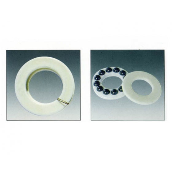 氧化鋯全陶瓷軸承系列: 全陶瓷軸承具抗磁電絕緣、耐磨耐腐蝕、無油自潤滑、耐高溫耐高 寒等特點,可用於極度惡劣環境及特殊狀況。套圈及滾動體採用氧 化鋯(ZrO2)陶瓷材料,保持器使用聚四氟乙烯(PTEE)作為標準 配置,一般也可使用玻璃纖維增強的尼龍66(GRPA66-25),特種工 程塑材(PEEK,PI),不銹鋼(AISI SUS316、SUS304),黃銅(Cu )等。 a. 推力球軸承