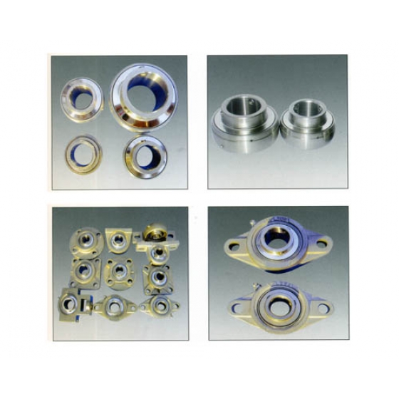 1. 不銹鋼外球面軸承 2. 不銹鋼帶座外球面軸承 不銹鋼軸承座及不銹鋼外球面軸承: 帶座外球面軸承具自動調心,多次重覆潤滑、防塵密封良好、安裝 拆卸方便等優點。被廣泛用於各種機械設備及傳送裝置。不銹鋼帶 座軸承是專門開發用以滿足食品、醫療、化工等行業的特殊需求。 在保證普通鉻鋼帶座軸承耐磨性能的同時,同樣具備耐腐蝕、清潔 的優點。軸承座採用AISI SUS304材料,外球面軸承使用AISI SUS440C材料。特殊用途也可使用AISI SUS316 材料。